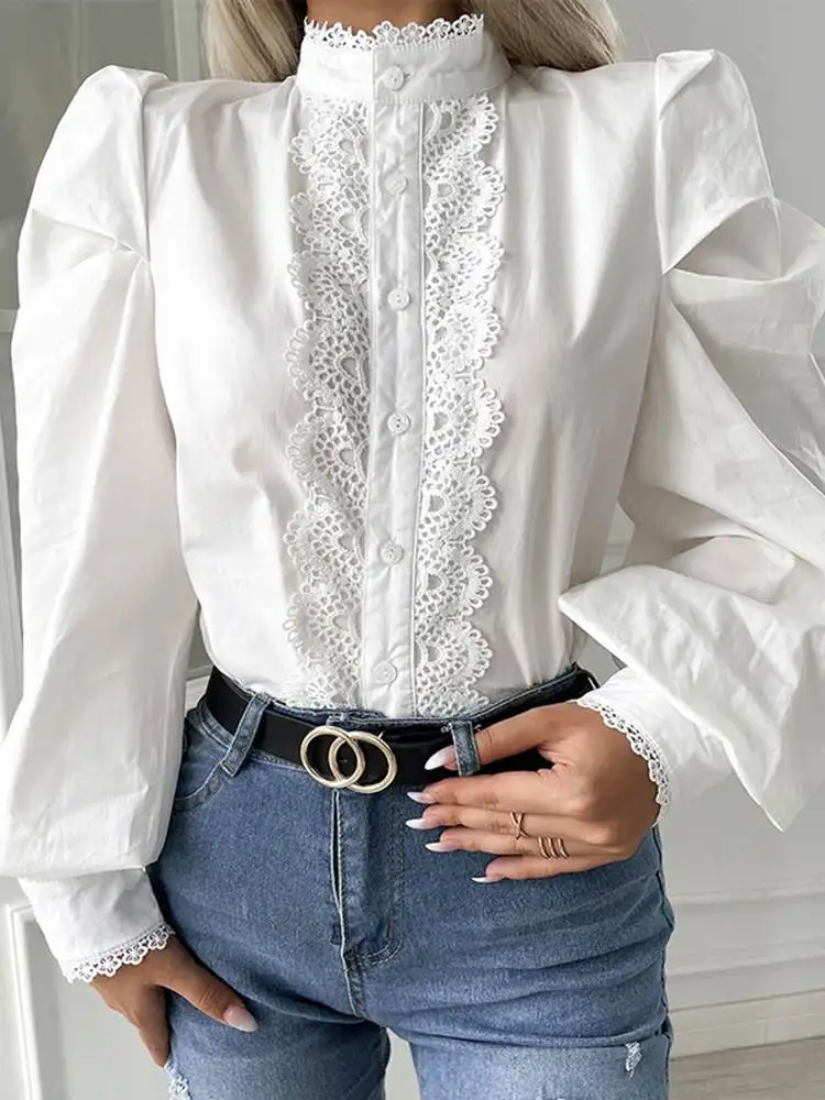 Celmia Lace Party Tunic Buttons Long Puff Sleeve 2022 Summer Casual Shirt Vintage Stand Collar Women Fashion Blouse Elegant Tops Women Shirt Aliexpress